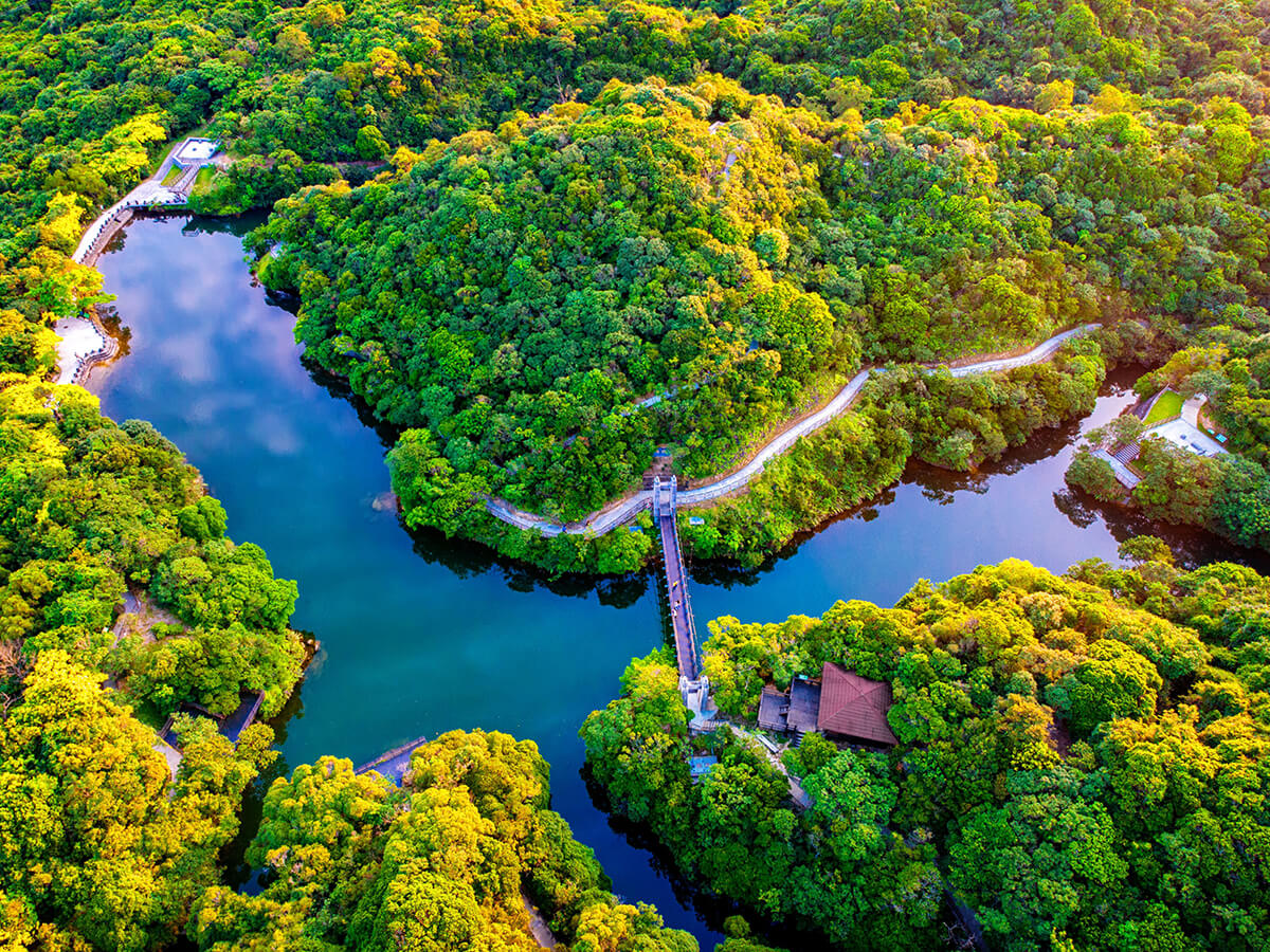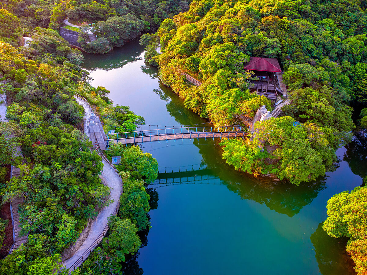隐藏在大武仑山半山腰上的情人湖公园,由六条山涧汇集而成,湖面清澈如镜,景色秀丽,山光水色交融成一幅如诗如画的景致,虫鸣鸟语不绝于耳,彩蝶轻舞于林间,仿佛大自然在邀请人们前来共度这段静谧而美好的时光。
