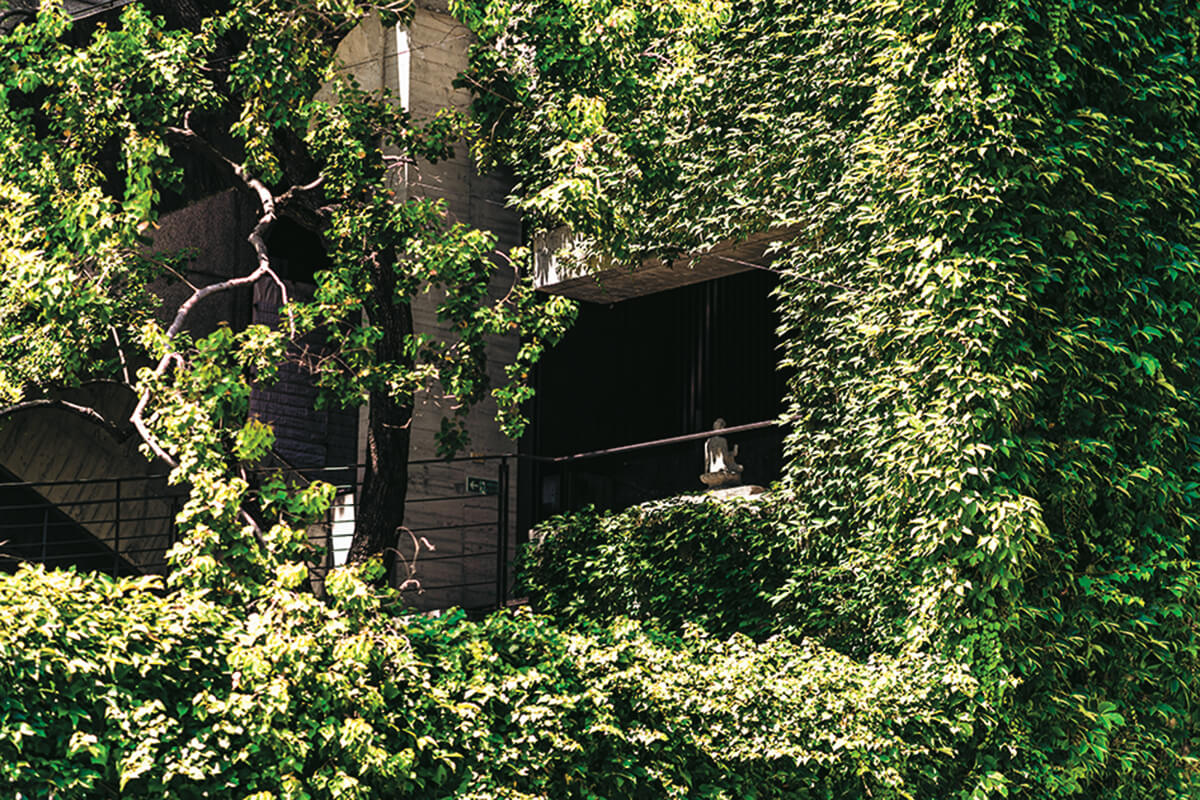 外墙上的爬墙虎生机盎然,建议早晨来光线最佳。 菩萨寺的样貌与植物紧紧相偎,春夏秋冬、四季荣枯造就了不同的建筑表情,原本冷冰冰的水泥有了温度、有了生命,当中也隐喻了人生若能打开心胸、包容接纳,便能找到更丰富的自己。