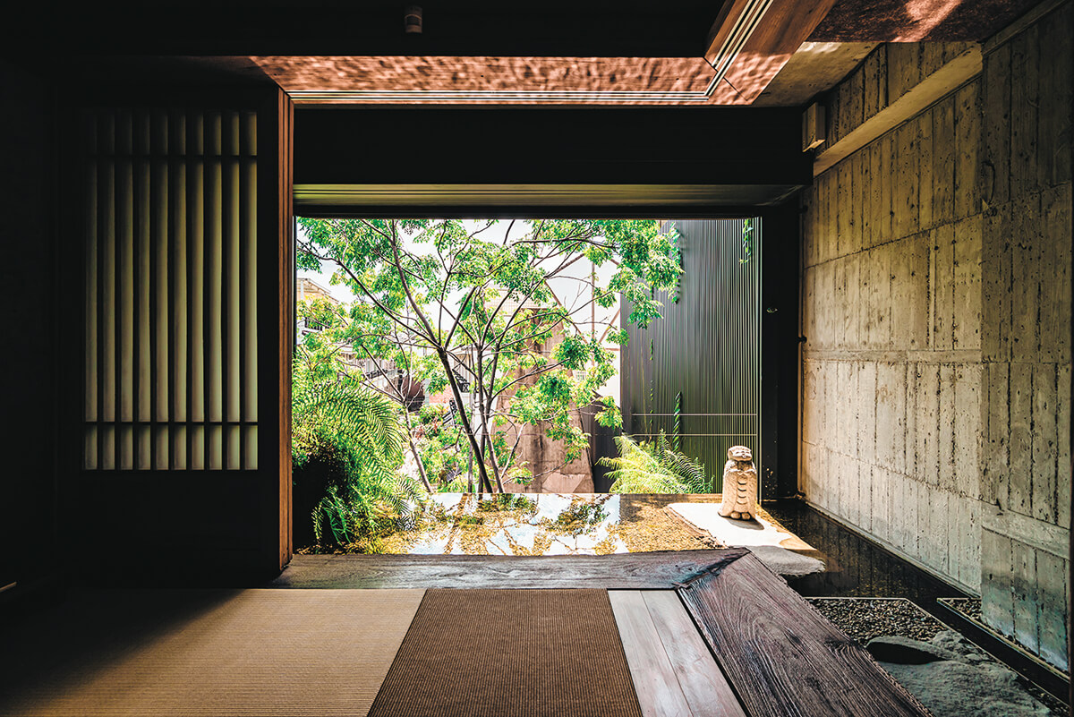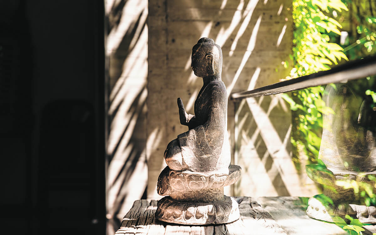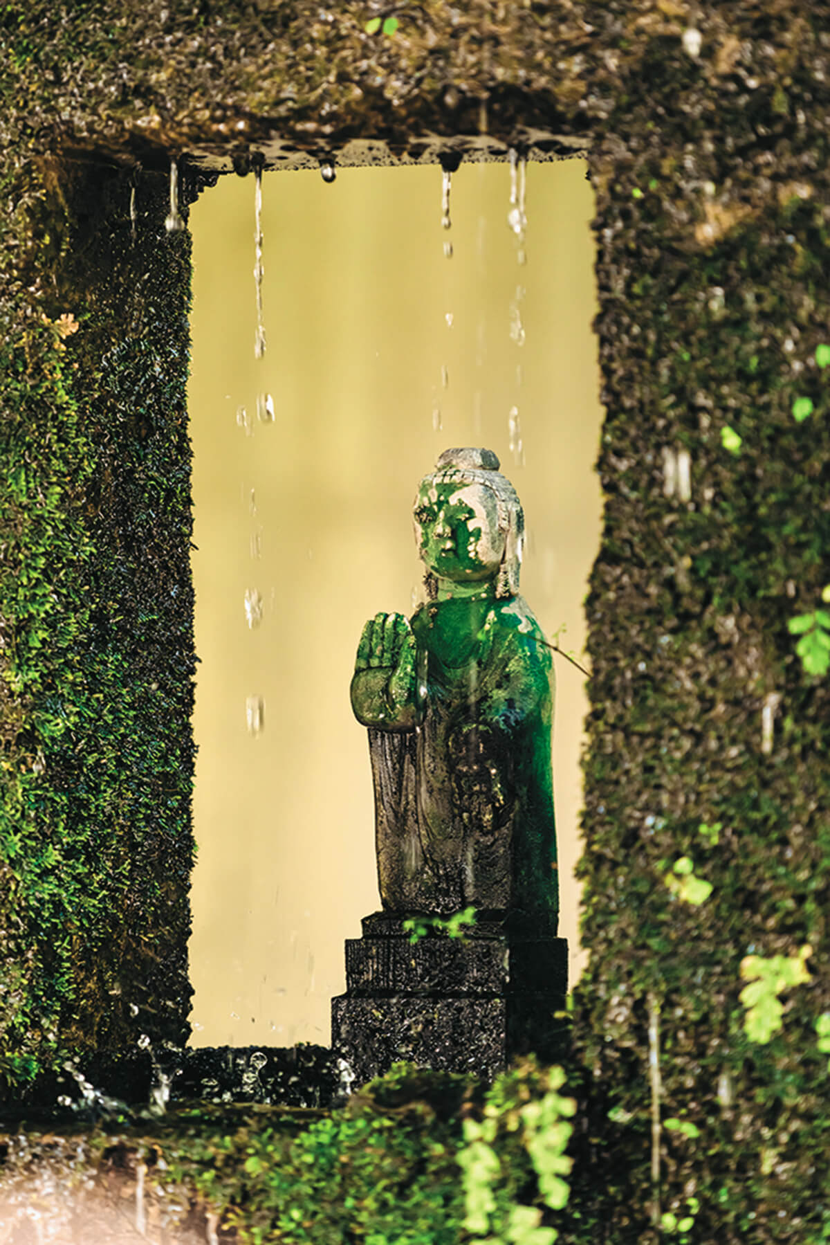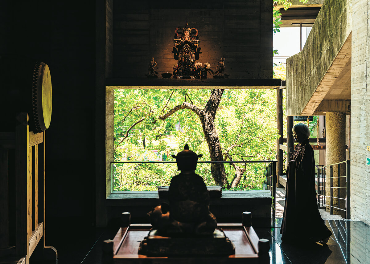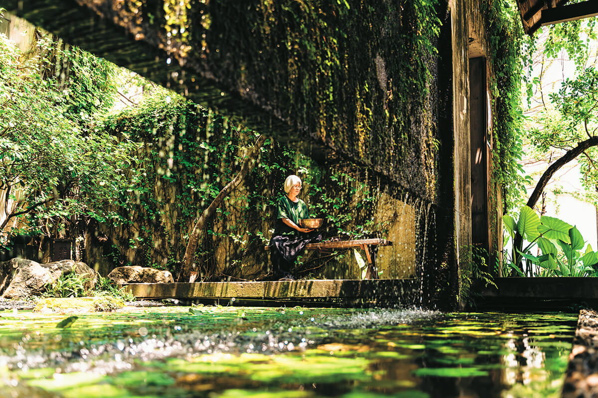 大门旁不定时流泄的水墙,打造出内外流通的空间。而水帘下的菩萨则象征了「时时浴佛,照顾自心」。 -