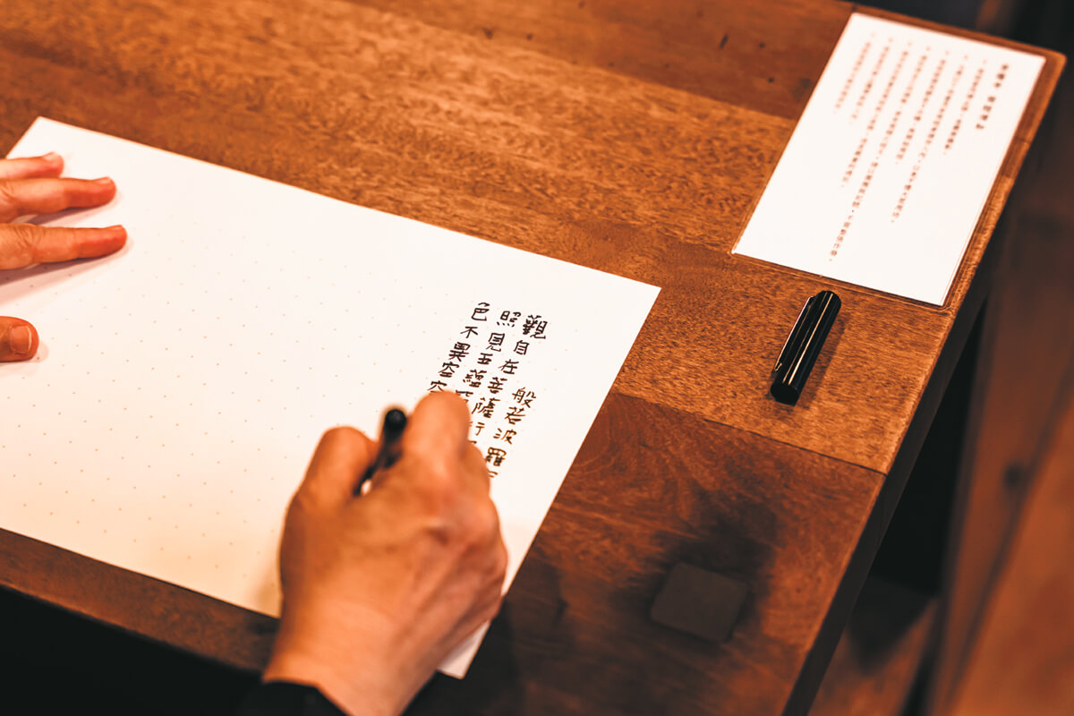每张桌上整齐地摆放一支笔,以及由慧光法师示范抄写的《般若波罗蜜多心经》,拿张白纸,静坐歇心,调匀呼吸后便可提笔抄写。经文字数不多,二百六十个字,过程当中,早已习惯敲键盘的手,随著一笔一画慢慢柔软下来,心也找到一点定锚的力量。写字而已,却很疗愈。